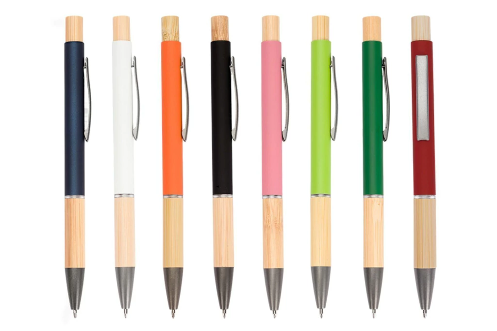 Descrição: Caneta com carga esferográfica azul de 1.0mm. Apresenta corpo metálico, detalhes em bambu e acionamento por clique, oferecendo uma pegada leve para uma escrita precisa.
