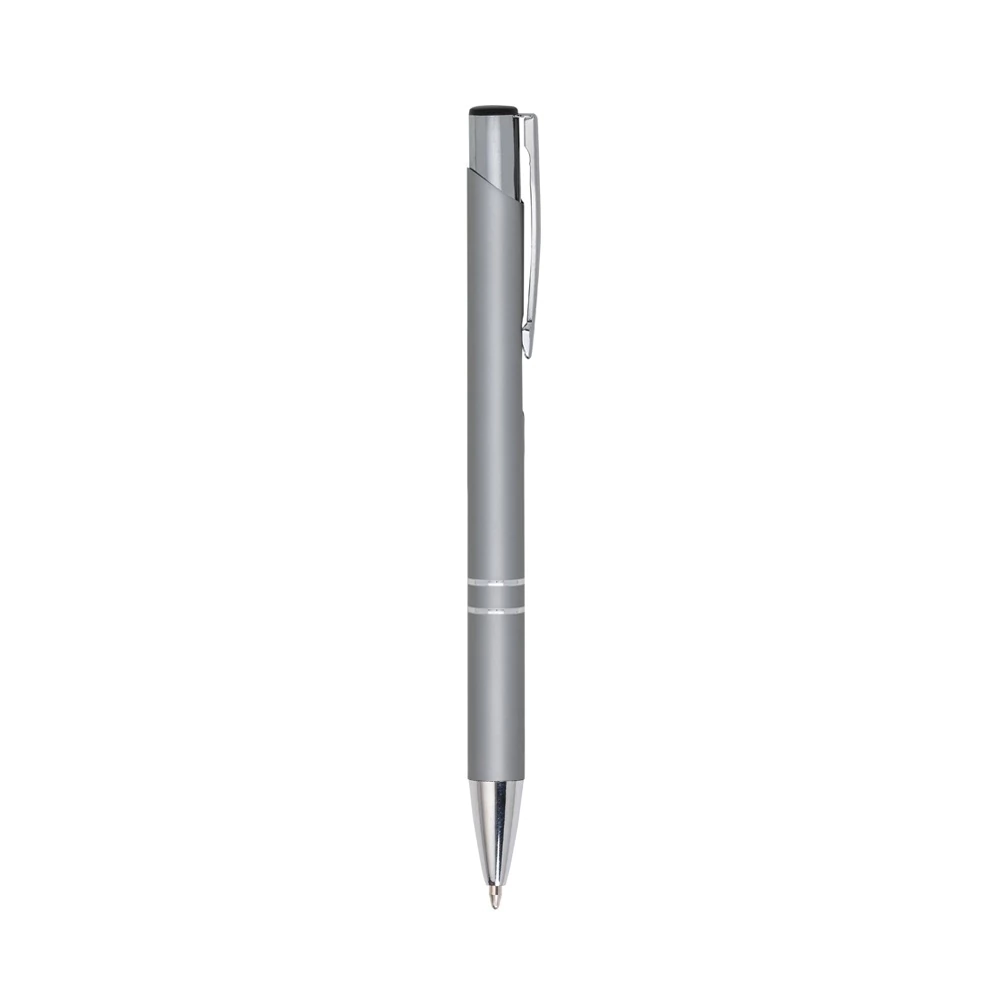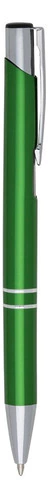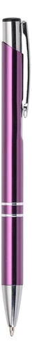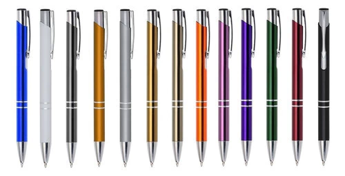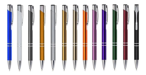 Descrição: Caneta metal inteira colorida com detalhes prata. Clip metal com a ponta do acionador preto, parte inferior com dois anéis prata. Aciona por clique.