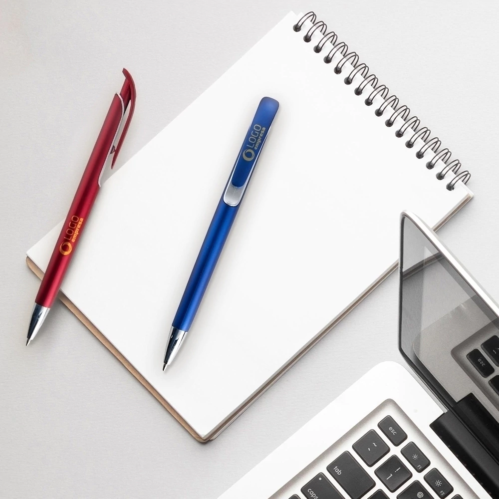 Caneta plástica com carga esferográfica azul 1mm e acionamento por clique.