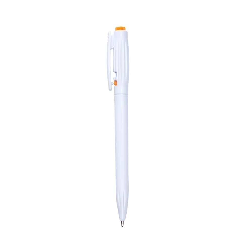 Descrição: Caneta plástica com carga esferográfica azul e acionamento por clique.