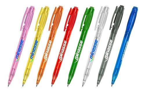 Descrição: Caneta plástica com carga esferográfica azul e acionamento por clique.
