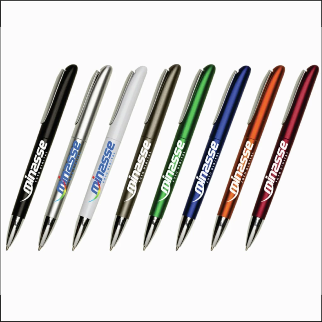 Descrição: Caneta plástica inteira colorida com detalhes prata.