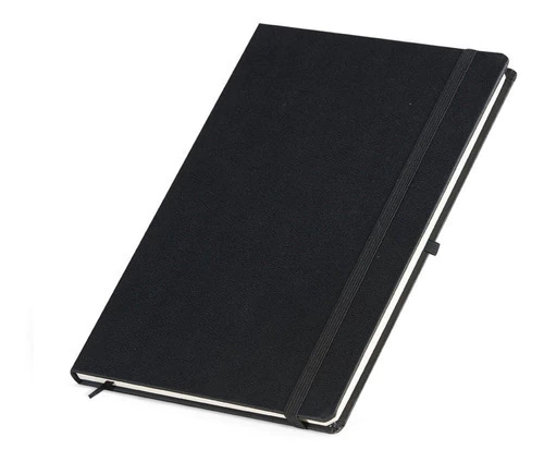 Descrição: Caderneta tipo moleskine em couro sintético com marcador de página em cetim e fita elástica para fechar. Contém aproximadamente 80 folhas com pauta.