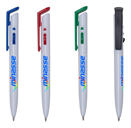 1097L: Caneta plástica branca com detalhes no acionador e destravador colorido.