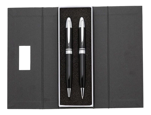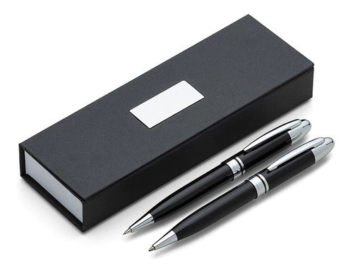 Descrição: Conjunto caneta e lapiseira em estojo de cartonagem com placa central para personalização. Clip metal e anel central possui: anel fino prata, anel preto fino e um anel maior prata com relevo e acionam por giro. Estojo revestida com espuma na parte interna.
