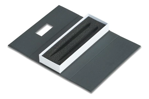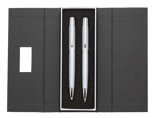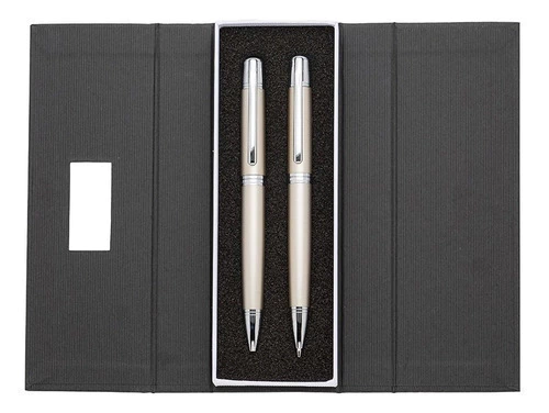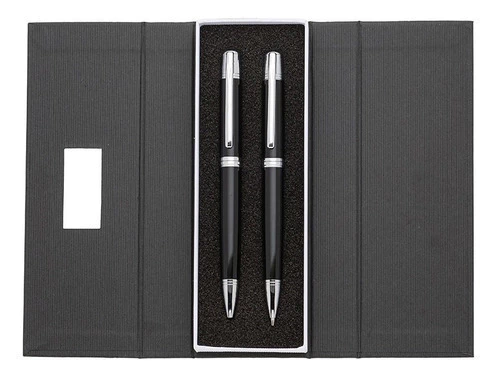 Descrição: Conjunto caneta e lapiseira em estojo de cartonagem com placa central para personalização. Clip metal com dois anéis em relevo, anel centralizado e dois anéis em relevo na ponteira e acionam por giro. Estojo revestida com espuma na parte interna.