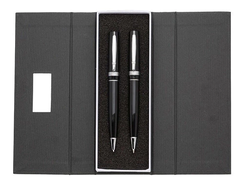 Descrição: Conjunto caneta e lapiseira em estojo de cartonagem com placa central para personalização. Caneta/Lapiseira metal inteira colorida com detalhes prata, clip metal com duas “linhas” e na “ponta” superior detalhe de uma linha no meio. Possui três anéis abaixo do clip, anel centralizado e anel inferior e acionam por giro. Estojo revestida com espuma na parte interna.