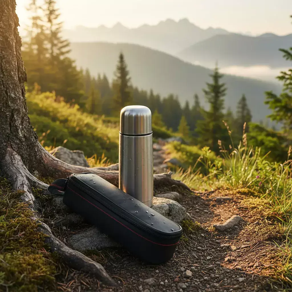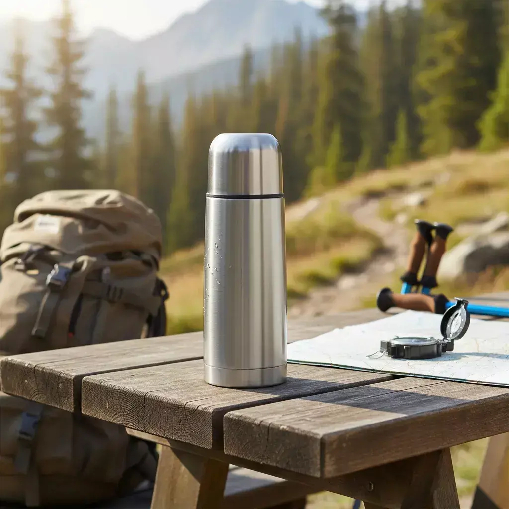 Descrição: Garrafa térmica 350ml em inox com tampa rosqueável, tampa interna em plástico resistente(basta um clique para abrir ou fechar). Acompanha capa protetora de couro sintético com alça de nylon.