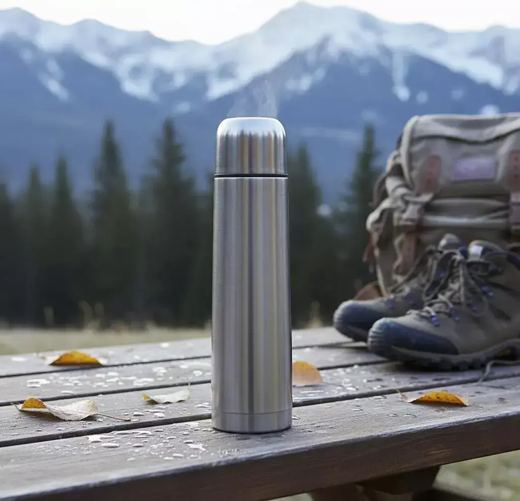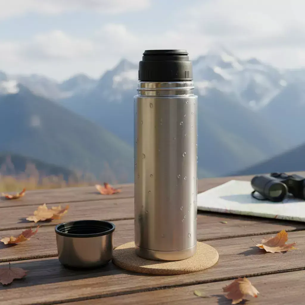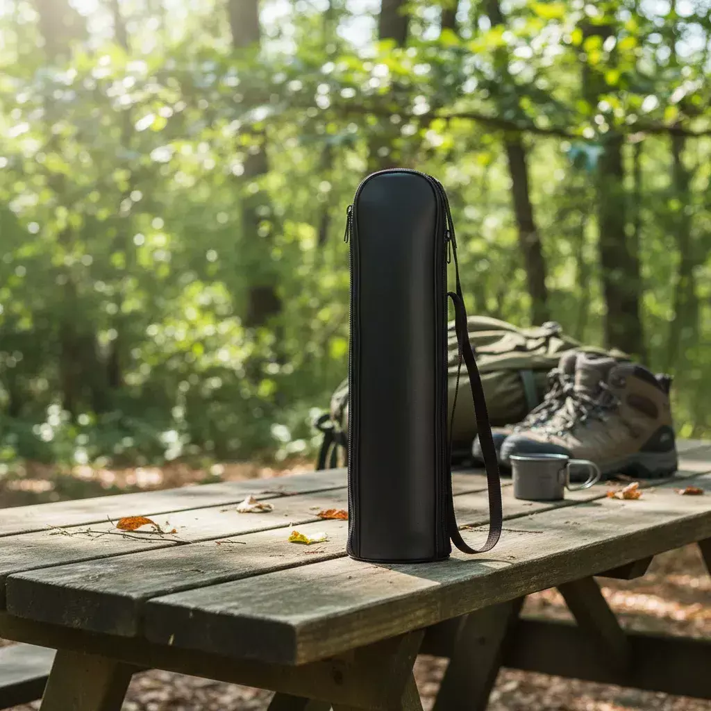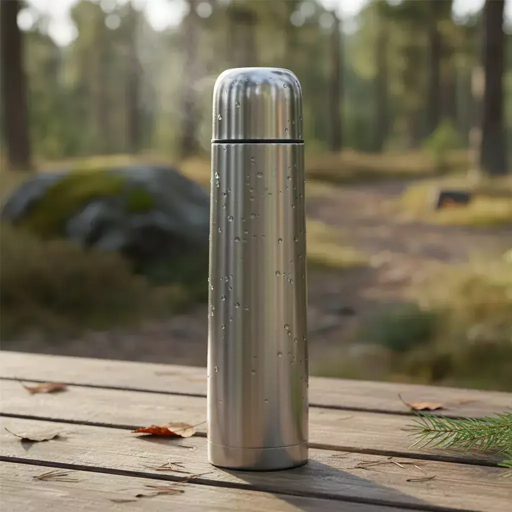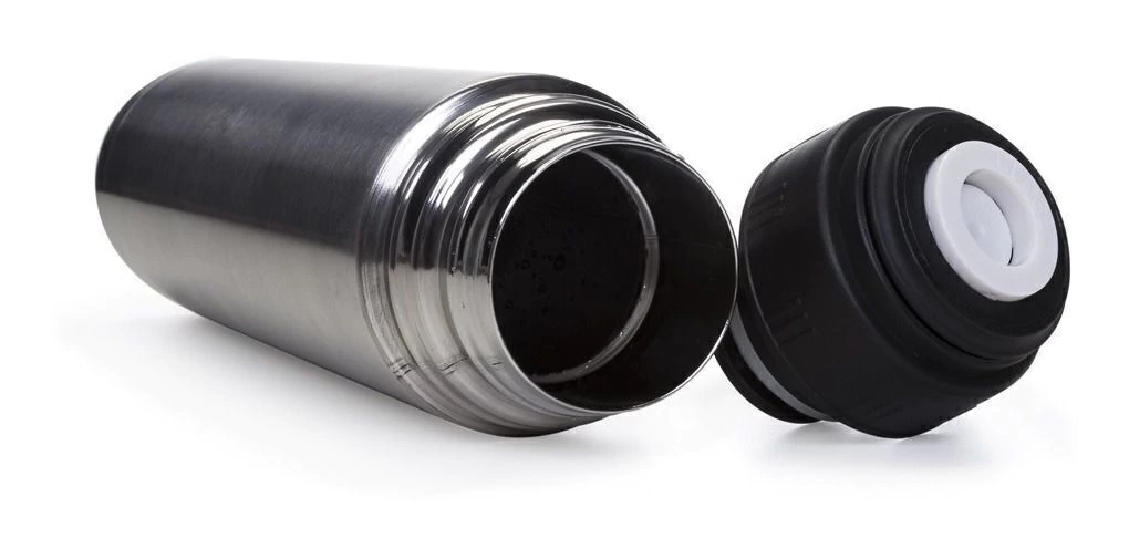 Descrição: Garrafa térmica 1L em inox com tampa rosqueável, tampa interna em plástico resistente(basta um clique para abrir ou fechar). Acompanha capa protetora de couro sintético com alça em nylon e detalhe vermelho.